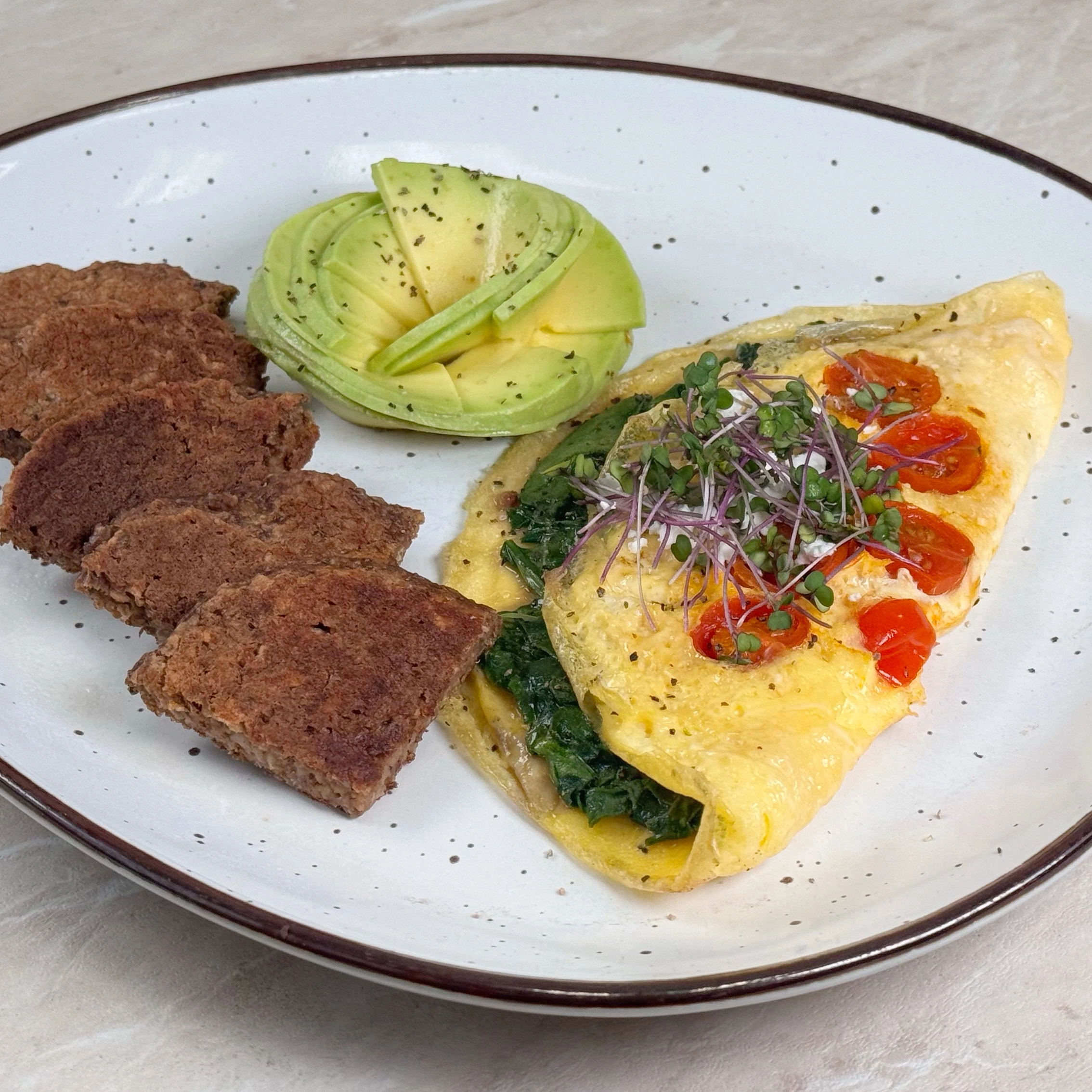 Omelette con espinacas, tomates cherry y queso de cabra. Acompañados con aguacate y panquecas de avena o Pan integral tostado.