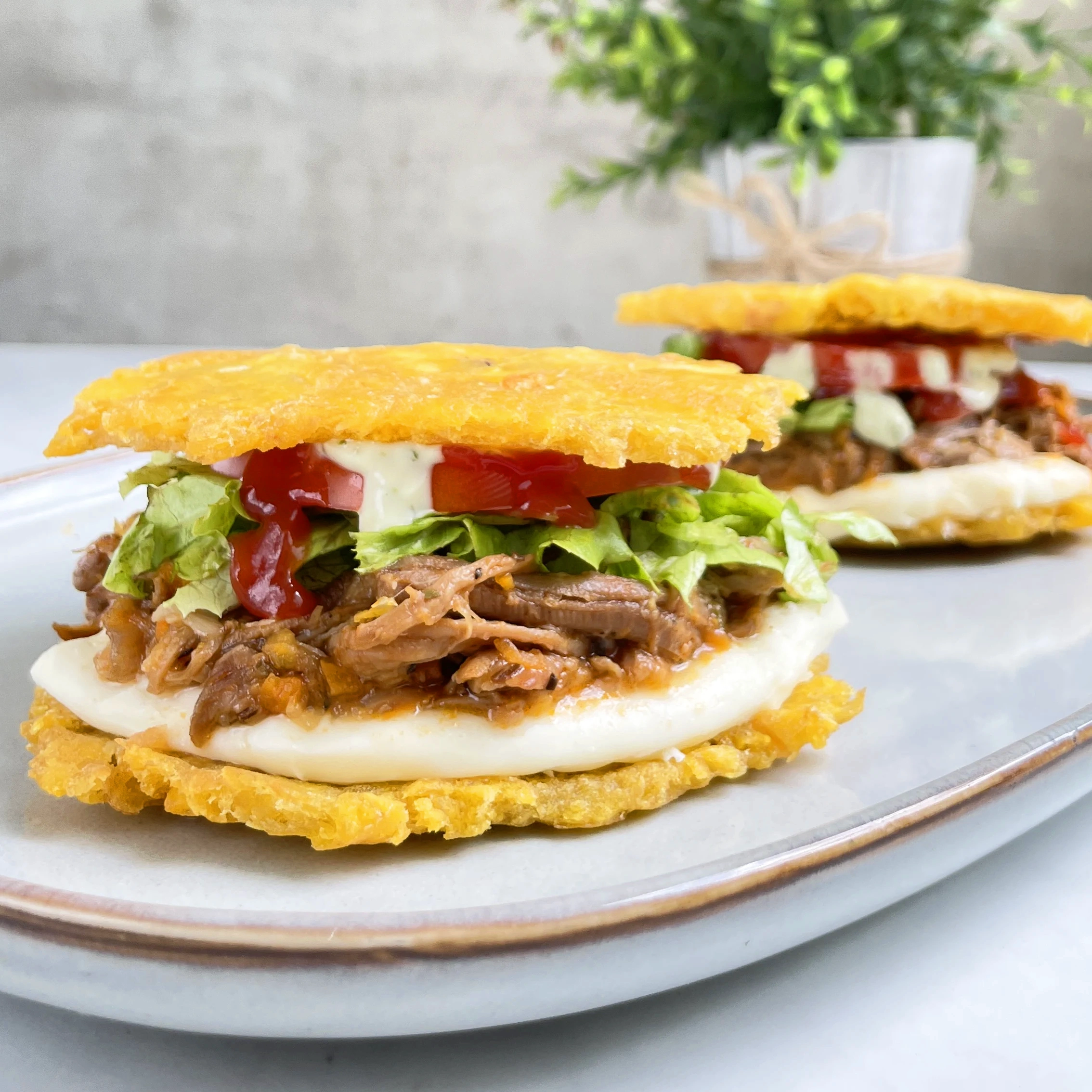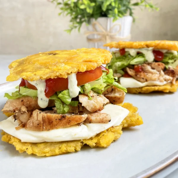 02 patacones con carne desmechada, tomate, queso, lechuga, salsa de tomate y green mayo. Elige entre plátano verde o amarillo.