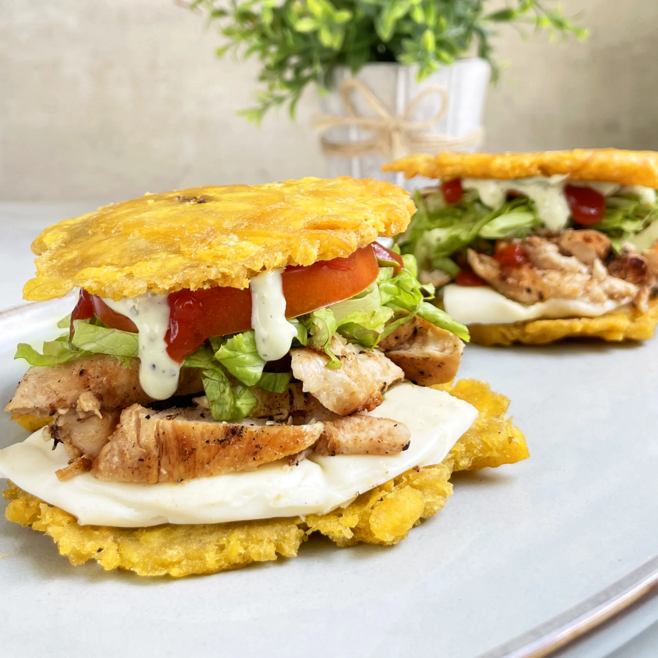 02 patacones con pollo al grill, tomate, queso, lechuga, salsa de tomate y green mayo. Elige entre plátano verde o amarillo.